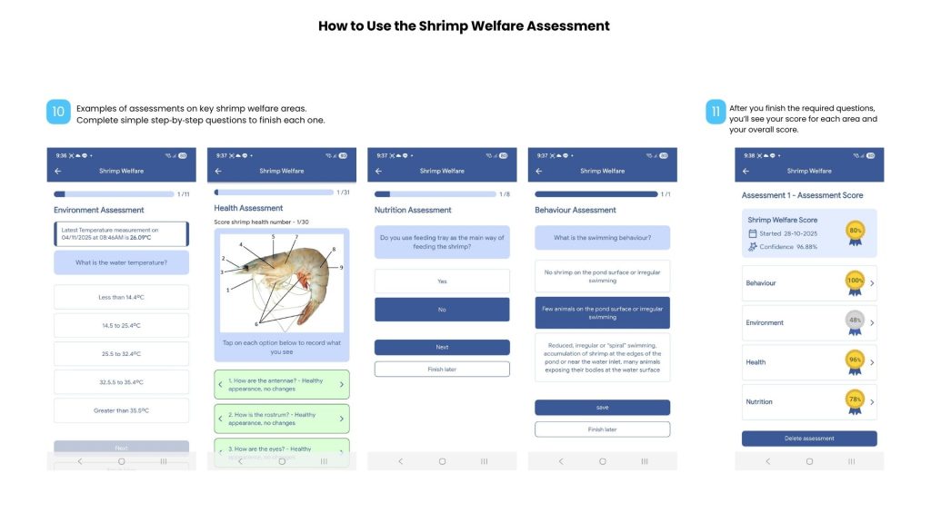 A: After completing the assessment, you’ll receive scores for environment, health, nutrition, and behavior. A low score highlights areas that need improvement, allowing you to make targeted adjustments to your pond and operations for better shrimp health and productivity.