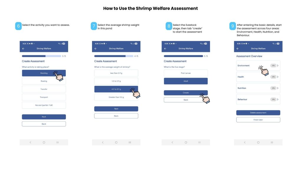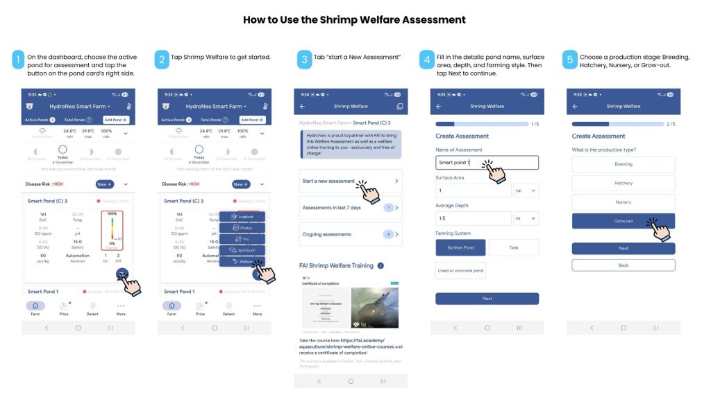 On each active pond dashboard, tap “Shrimp Welfare” to begin.